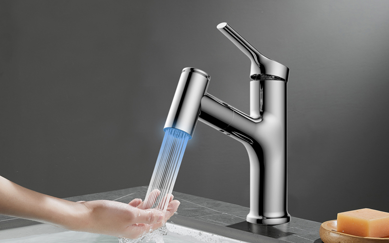 360 ° omnidirectional pulling and cleaning; The low-light faucet can be used late at night without turning on the headlights, without dazzling; Daily shampoo, easy to wash by pulling water; Press to switch the two-function spray; Three color LED lights display water temperature; Gravity hammer reset design, smooth expansion and accurate return; Without tools, push and screw for 10 seconds